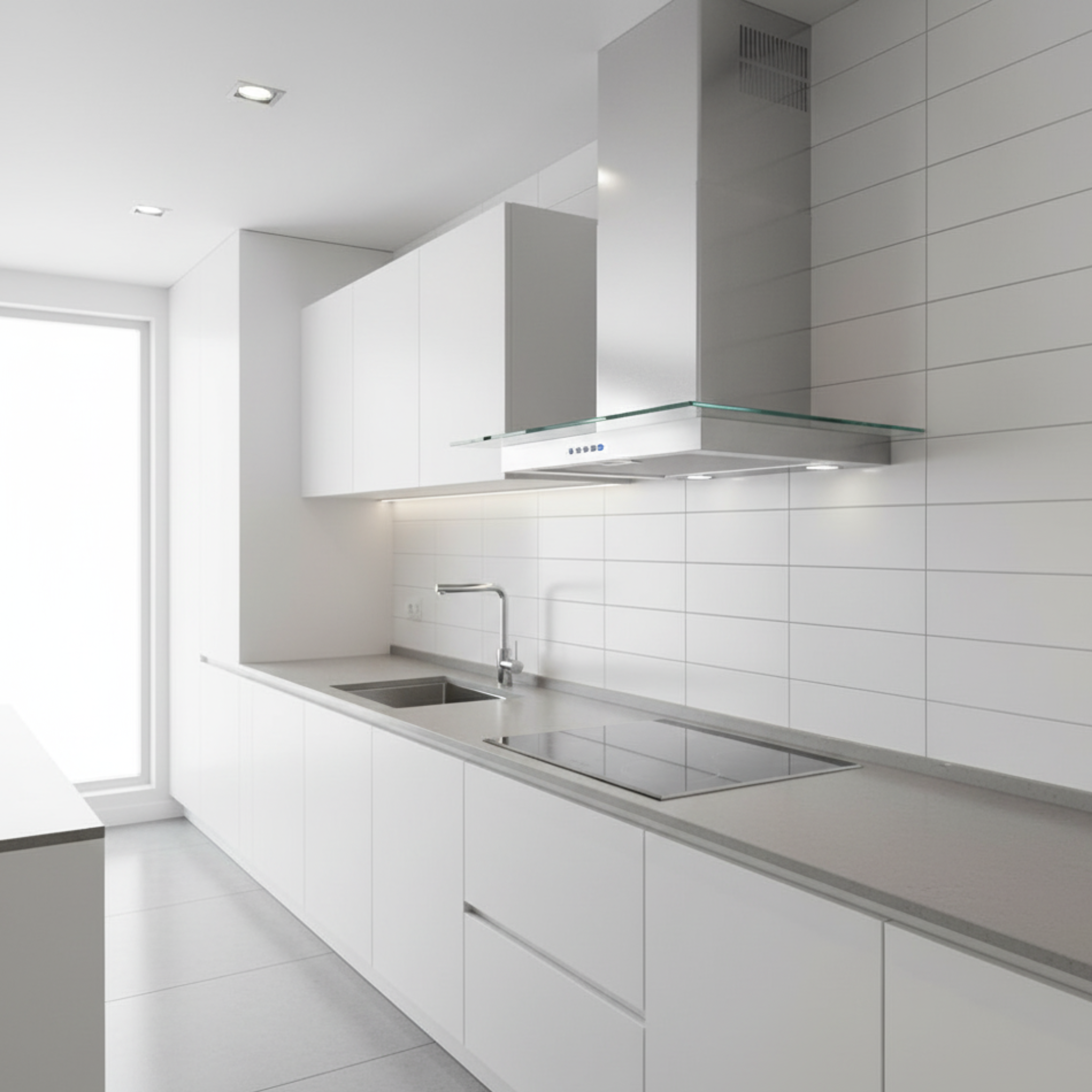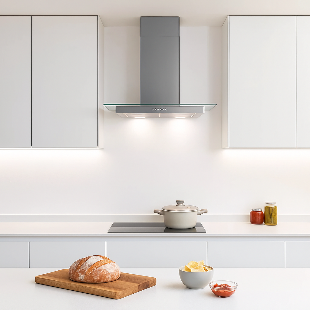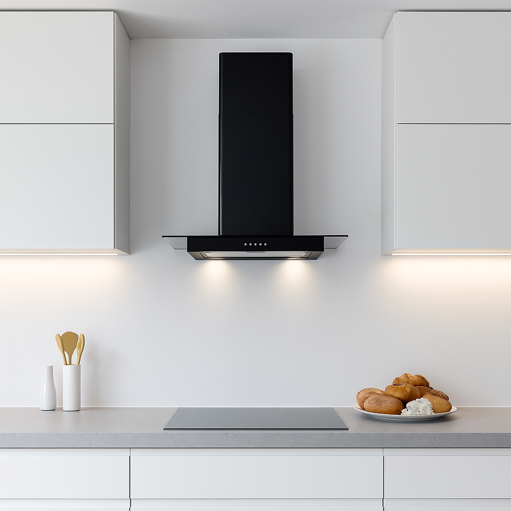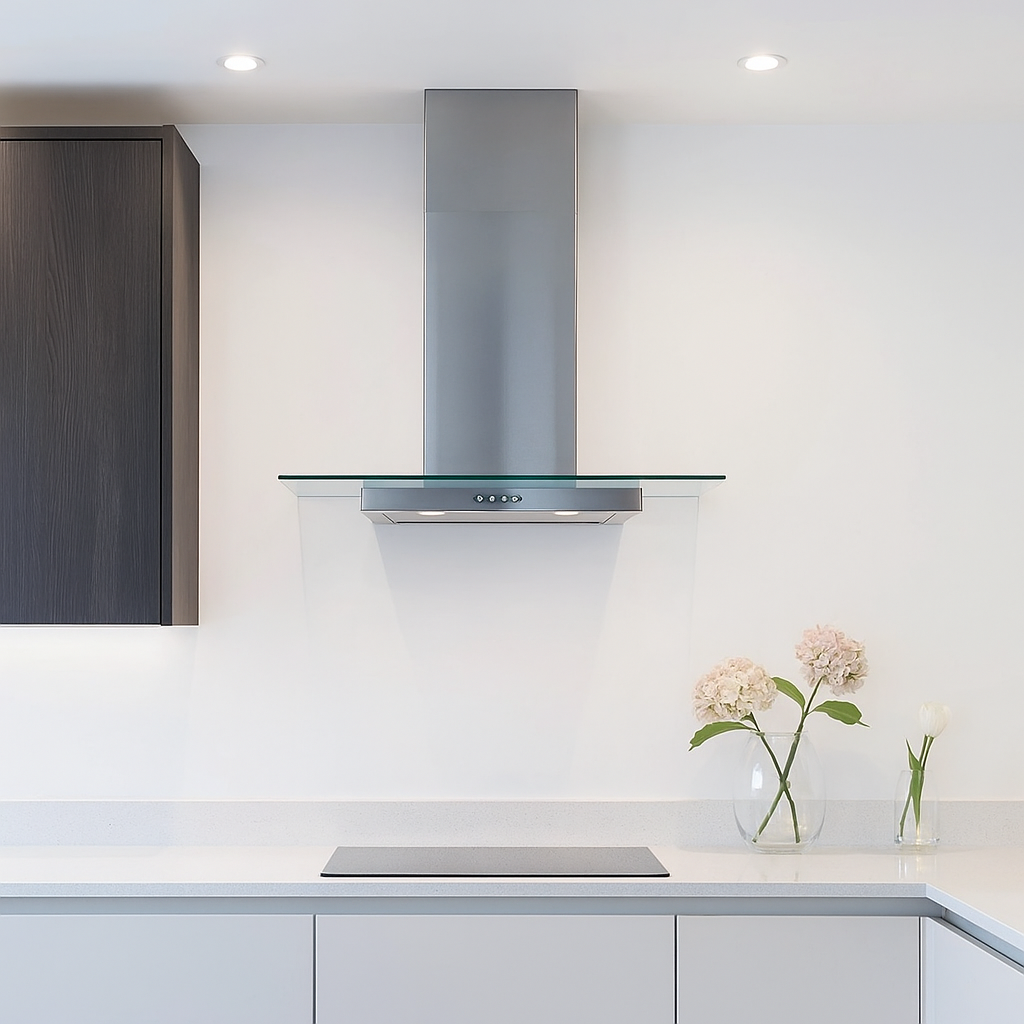 Featuring a flat glass canopy and a minimalist straight design, this hood combines reliable extraction with refined aesthetics—perfect for modern and transitional kitchens.